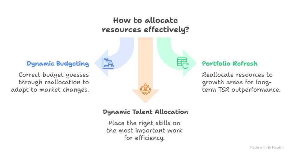 Long‑term TSR outperformers refresh their portfolio and shift resources to growth more often than peers (see McKinsey’s paths to TSR outperformance and guidance on tying short‑term decisions to long‑term strategy). Leading firms also move people faster, dynamic talent allocation puts the right skills on the most important work (example and playbook).